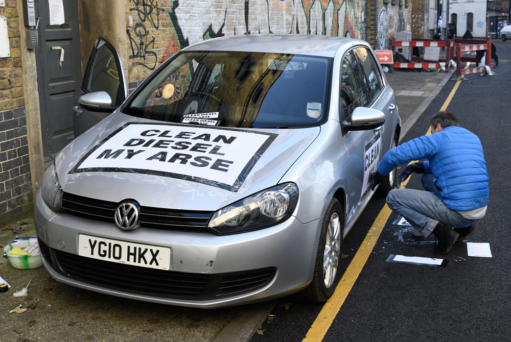 Hell yes, I want to do this. I want to turn my car into a screaming placard and leave it parked in the street for everyone to see. Ha, I could drive it to VW showrooms. Or drive slowly through London streets so more people would see it. Here I am world. The lone protester. Just me and my filthy little Golf. Spread the word.